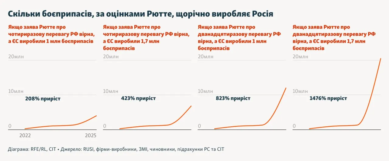 Если заявление Рютте о четырехкратном преимуществе России правильное, а ЕС произвел миллион боеприпасов, это означает, что в России с 2022 по 2025 годы был прирост более 200%.
