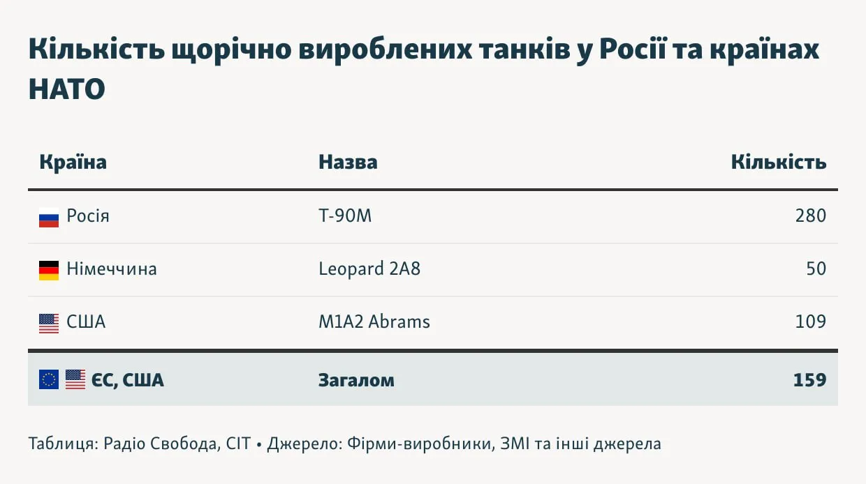 Общее количество танков, которые производят в странах НАТО, – не менее 159 единиц в год против 280 в России.