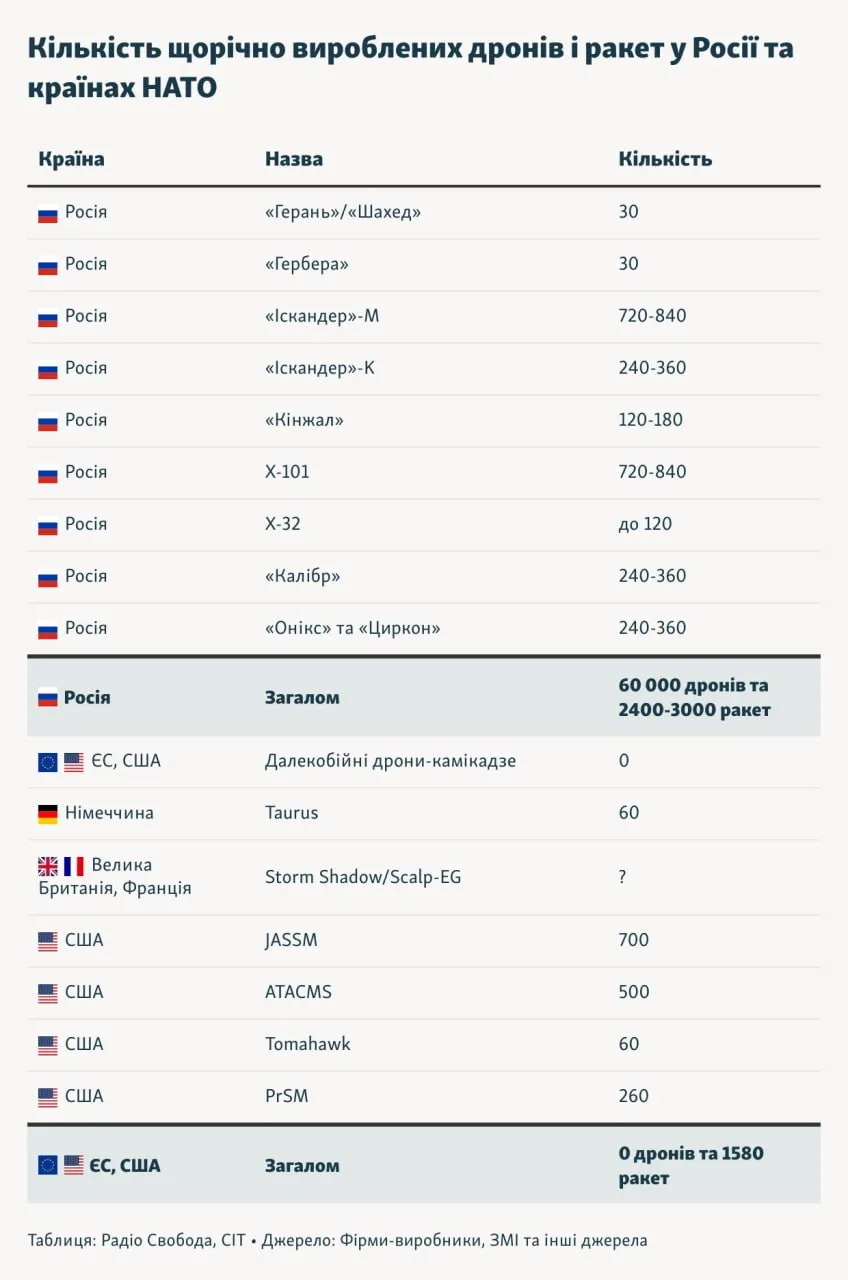 Серийный выпуск дальнобойных ракет в Европе ведет пока только Германия, изготавливая 60 ракет Taurus в год. Франция и Великобритания договорились возобновить выпуск ракет Storm Shadow/Scalp-EG. США производят JASSM, ATACMS и "томагавки", однако ракет у россиян все равно больше.
