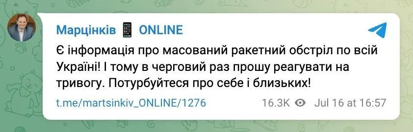- 16 июля мэр Ивано-Франковска Руслан Марцинкив сообщил, что есть информация о массированном ракетном обстреле всей Украины. Он призвал не пренебрегать своей безопасностью и направляться к укрытию.