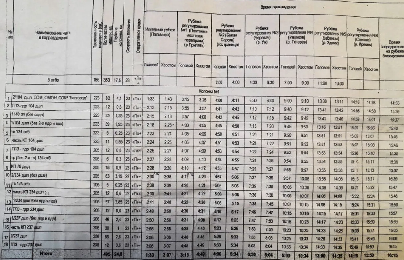 Приказы для части 26 танкового полка предусматривали возможное сопротивление со стороны украинцев. Но россияне все-таки запланировали почти беспрепятственный 24-часовой рывок от границы Украины с Россией до точки у реки Днепр – примерно на 402 километра.