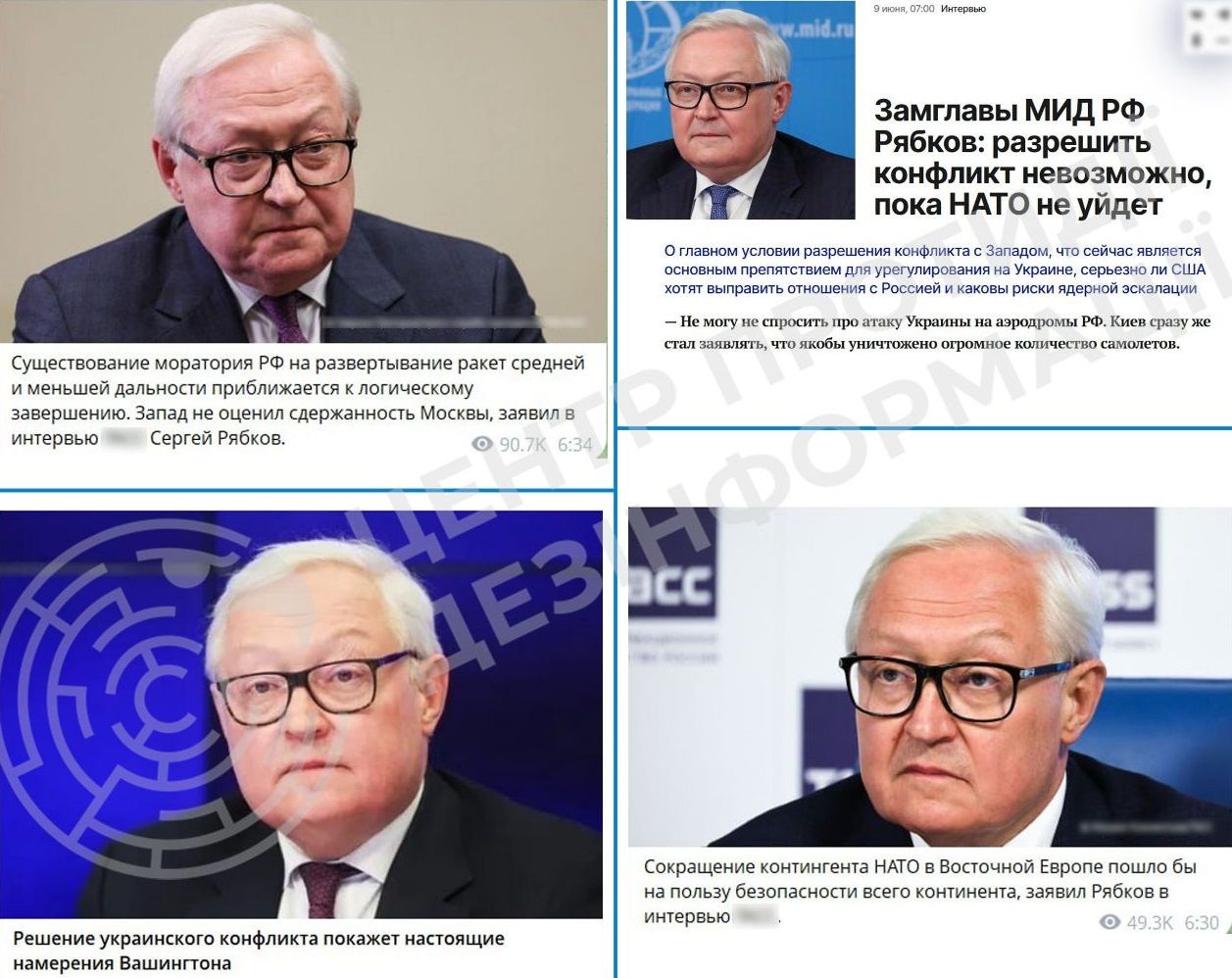 Об этом в понедельник, 9 июня, предупредили в Центре противодействия дезинформации при СНБО, передает 24 Канал. Там обратили внимание на последнее интервью заместителя министра иностранных дел страны-агрессора Сергея Рябкова.