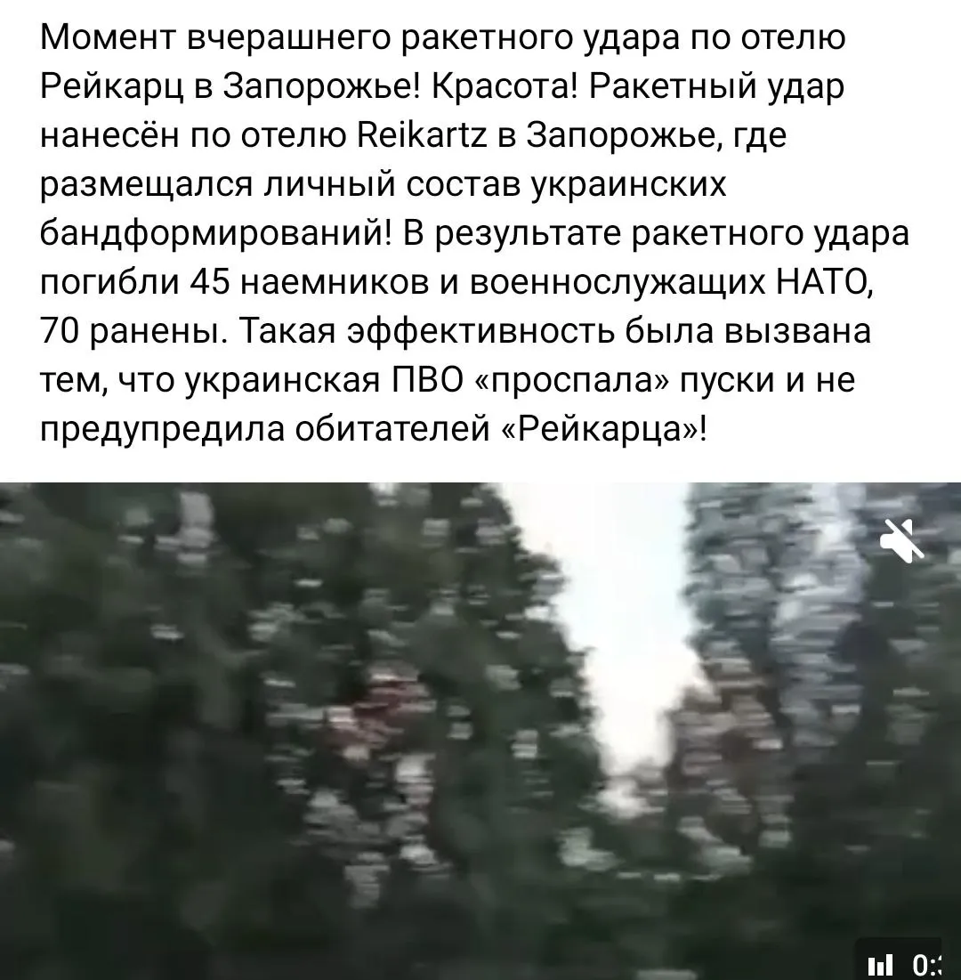 - По имеющимся данным, воздушная тревога в Запорожской области прозвучала в 19.17. Тогда же предупреждали, что существует опасность с Юга. А уже через несколько минут поступило сообщение о том, что в областном центре раздался взрыв. Враг попал в отель Reikartz.
