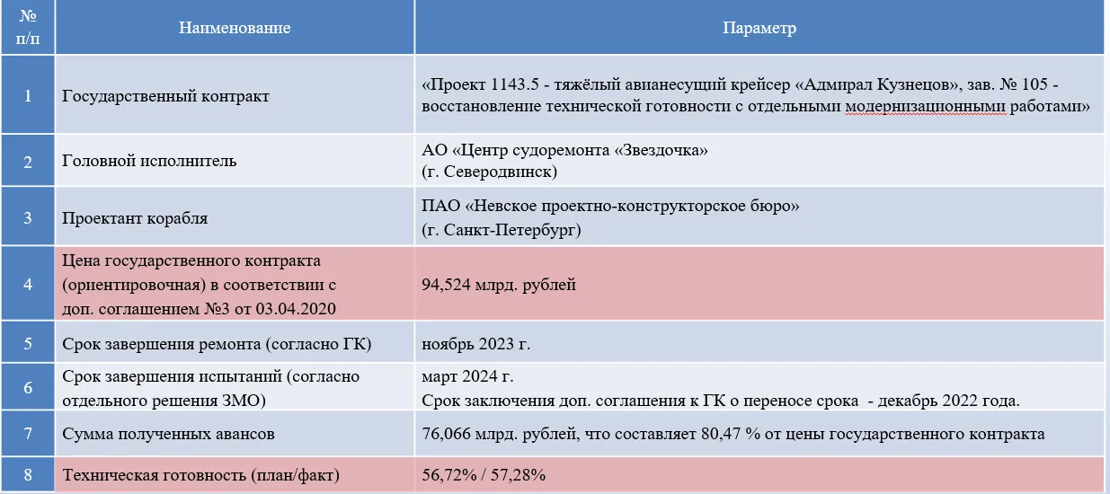 На конец 2022 года, согласно внутренней документации, ремонт авианосца стоил почти 95 миллиардов рублей, а уровень готовности составлял лишь 57%. Сроки сдачи корабля постоянно переносят, а экипаж перевели в новообразованный батальон "Фрегат", который отправили на пехотные штурмы.