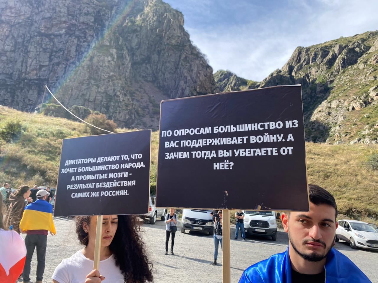 Так, грузины с флагами Украины с плакатов спрашивали, зачем россияне бегут от войны, которую большинство из них поддерживали. А также прямым текстом на английском языке, заглавными буквами подчеркивали, что российских дезертиров в Грузии не ждут.
