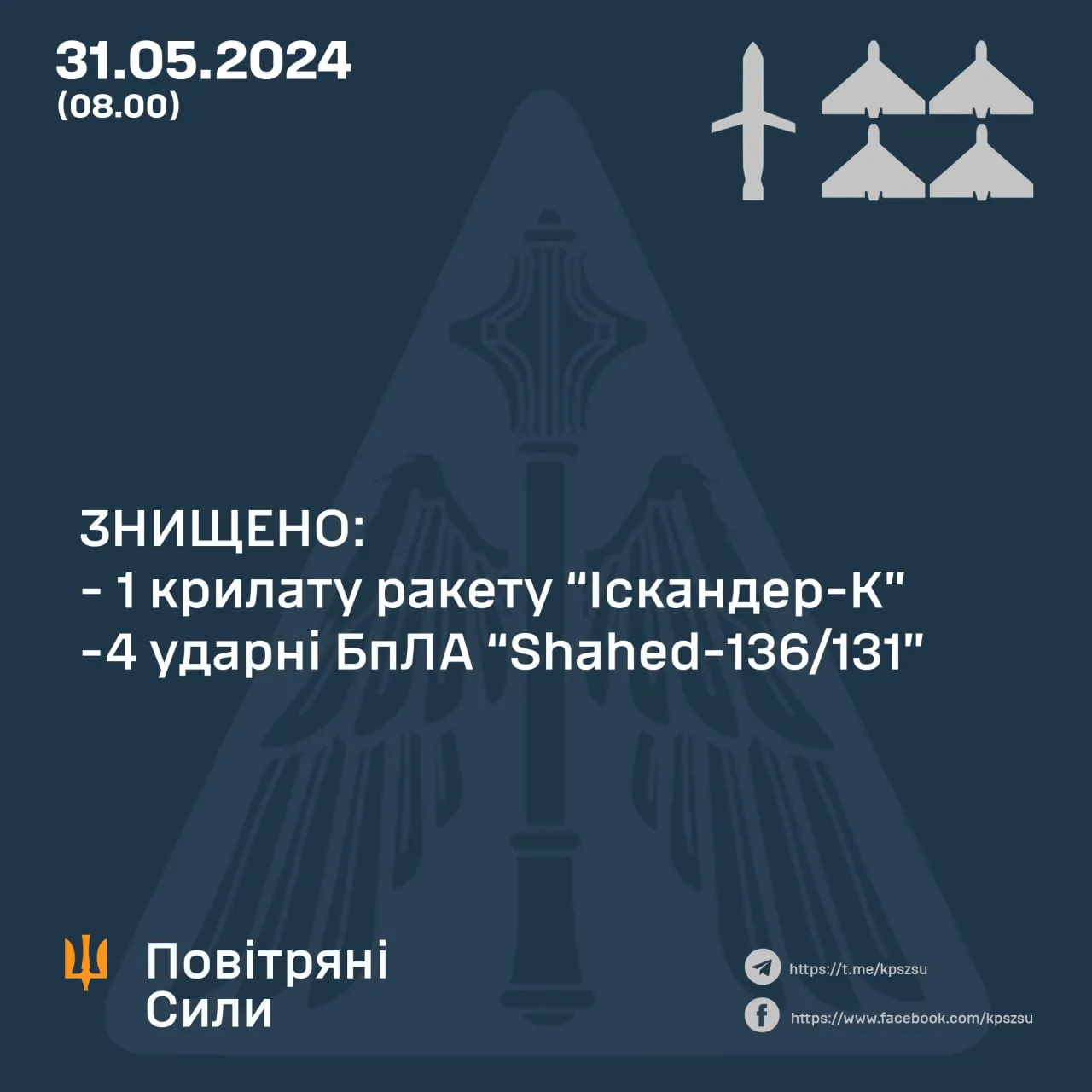 "В результате боевой работы зенитными ракетными подразделениями и расчетами мобильных огневых групп уничтожено четыре "Шахеды" в пределах Киевской, Запорожской, Днепропетровской областей, а также крылатую ракету "Искандер-К" на Киевщине", – говорится в сообщении.