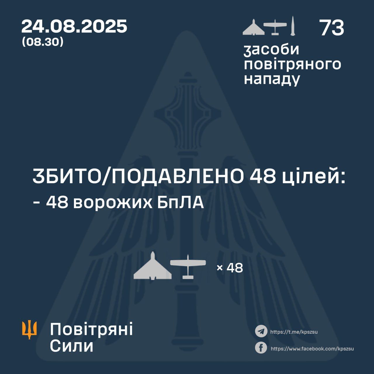 - В ночь на 24 августа российская армия запустила по Украине 73 вражеские цели, из которых ПВО обезвредила большинство дронов.