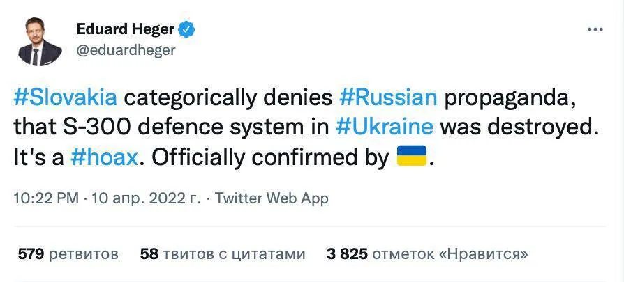 Руководитель ОП рассказал, что один из последних фейков – якобы уничтожение переданных Словакией ЗРК С-300. В то же время эту информацию опроверг премьер Эдуард Хегер.