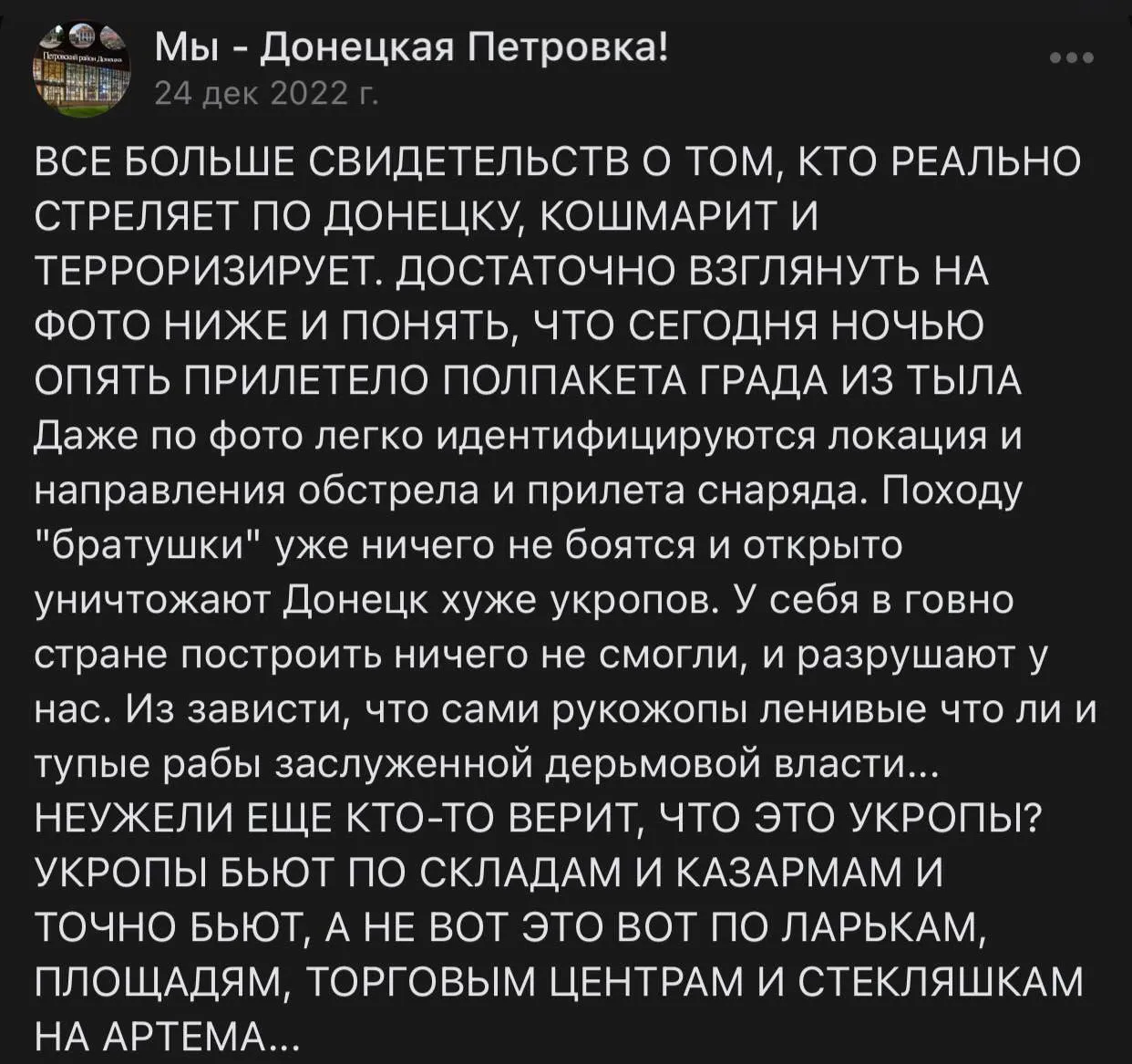 "Сегодня ночью (24 декабря – 24 канал) снова прилетело из "Града" с тыла. Даже за фото легко идентифицируются локация и направления обстрела и прилета снаряда. Походу "братушки" уже ничего не боятся и открыто уничтожают Донецк хуже укропов", – написали в сообществе.