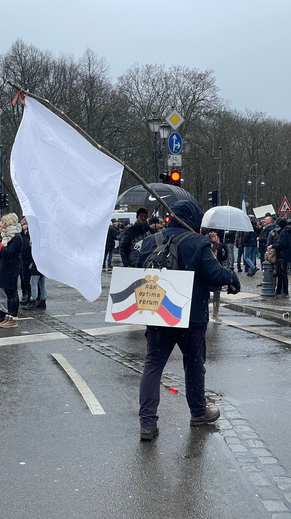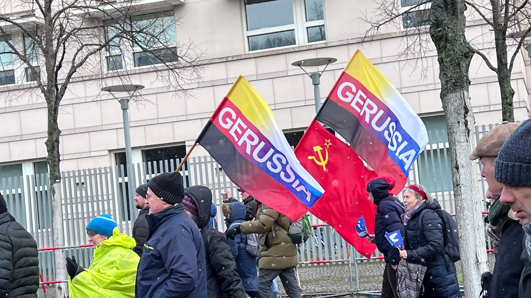 Также на флагах развевался лозунг Gerrussia, написанный на английском языке, хотя сами немцы свою страну называют Deutschland, а Россию – Russland.