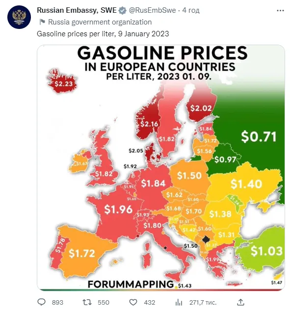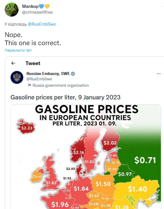 Дипломаты хотели показать карту с ценами на бензин в разных странах и доказать, что лучше всего жить в России и Беларуси. Однако забыли указания Кремля и оставили Крым в составе Украины. На это отреагировали пользователи в твиттере.
