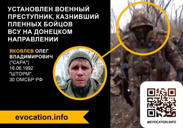 Об этом 24 Канал пишет со ссылкой на команду Еvocation.info. Она установила, что 6 украинских бойцов прицельным выстрелом в спину убил россиянин Олег Яковлев. Он является бойцом подразделения "Шторм", который участвовал в оккупации населенных пунктов в Донецкой области.