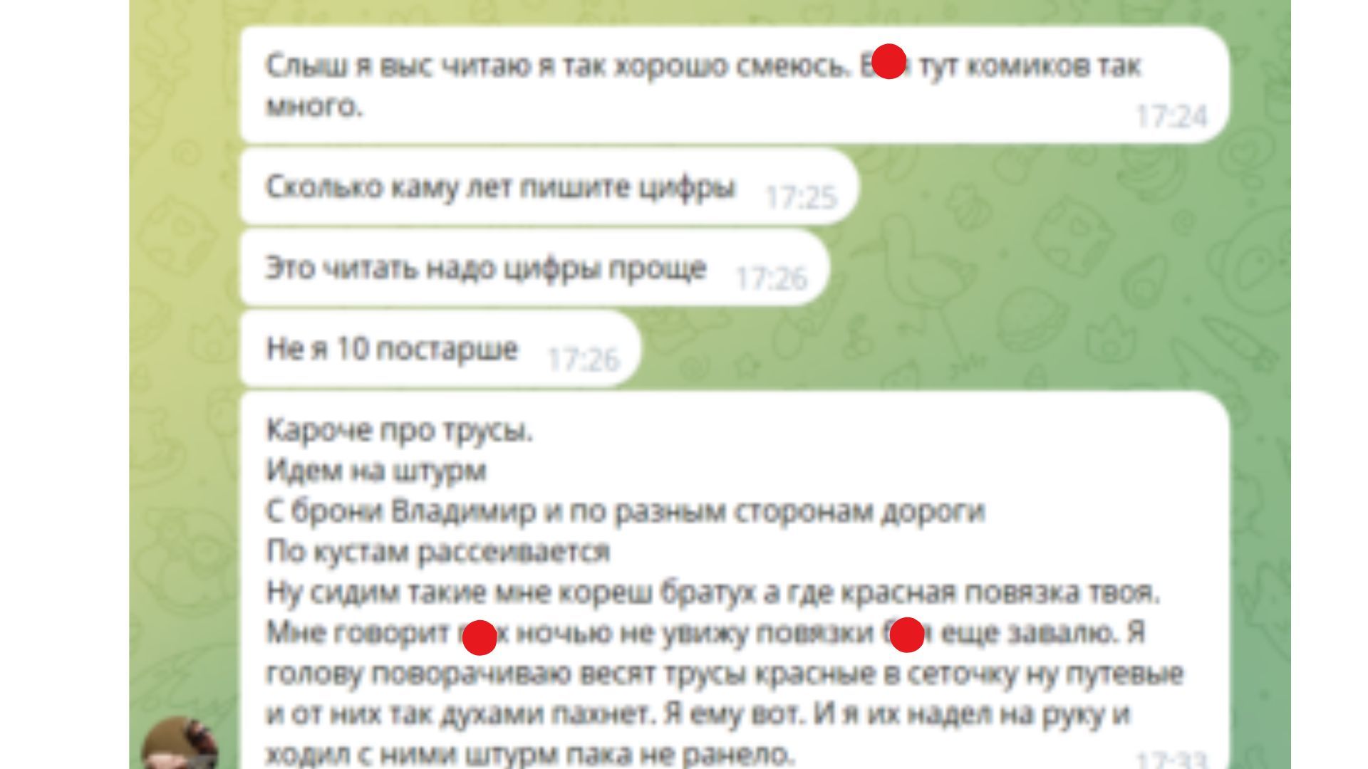 Мужчина пытался найти себе пару через чат знакомств. Он делился с пользователями историей о красных трусах, с которыми он ходил в штурм. Неудивительно, что сообщения написаны с кучей ошибок.