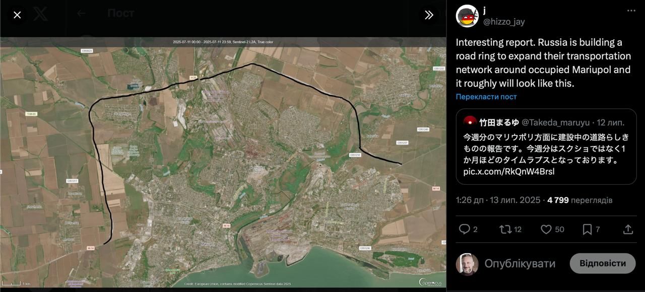 Спутниковые фото указывают на то, что россияне строят кольцевую дорогу вокруг Мариуполя. Скорее всего, делают это для улучшения военной логистики, хотя уверяют местных в обратном.