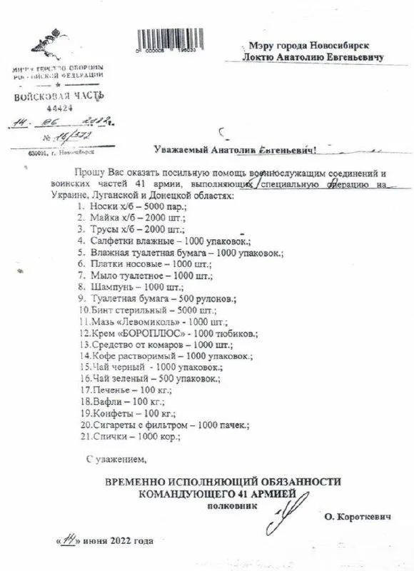 Согласно документу, полковник Короткевич обратился с просьбой поддержать военнослужащих объединений и воинских частей 41 армии предметами первой необходимости. Он убежден, что это – посильная помощь для мэра Новосибирска Анатолия Локтя. По словам полковника, россияне, которые сейчас выполняют "специальную операцию на Украине, в Донецкой и Луганской областях", больше всего нуждаются в: