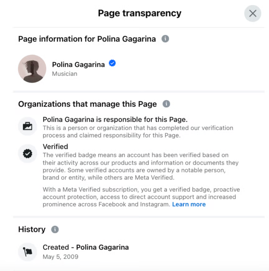 Интересно! Страница Polina Gagarina в Facebook имеет синюю отметку подтверждения. Полина Гагарина официально подтвердила право собственности на эту страницу, воспользовавшись функцией Facebook Claim Responsibility for a Page. На странице также указана ссылка на ее официальный веб-сайт. Вероятно, страница имеет географические ограничения для просмотра в Европе, что дополнительно подтверждает ее подлинность, а также то, что Facebook осведомлен о ее существовании и принадлежности.