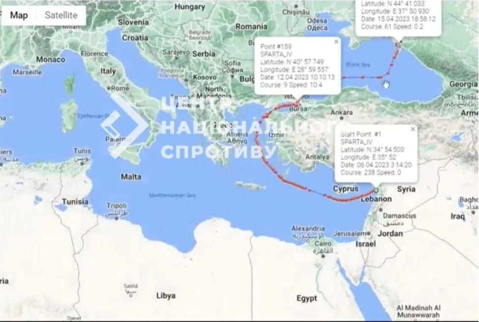 Согласно данным системы, еще в апреле 2023 года российский грузовой корабль "Спарта-4" курсировал между сирийским Тартусом и Новороссийском в Краснодарском крае через Дарданеллы и Босфор. Этот корабль, как и "Спарта", "Спарта-2", принадлежат логистической компании минобороны России "Оборонлогистика".