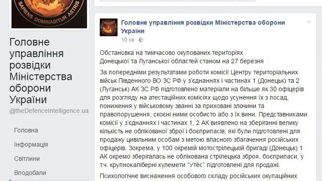"По предварительным результатам работы комиссии Центра территориальных войск Южного ВО ВС РФ в соединениях и частях 1 (Донецк) и 2 (Луганск) АК ВС РФ, подготовлены материалы на более 30 офицеров для рассмотрения на аттестационных комиссиях по устранению их с должностей, понижение в воинском звании за скрытые преступления и правонарушения, совершенные ими лично или по их вине", – говорится в сообщении разведки.