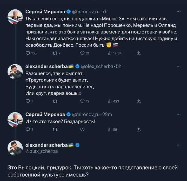 Это еще раз доказала перепалка в твиттере между украинским дипломатом Александром Щербой и главой фракции "Справедливая Россия" в Госдуме Сергеем Мироновым.