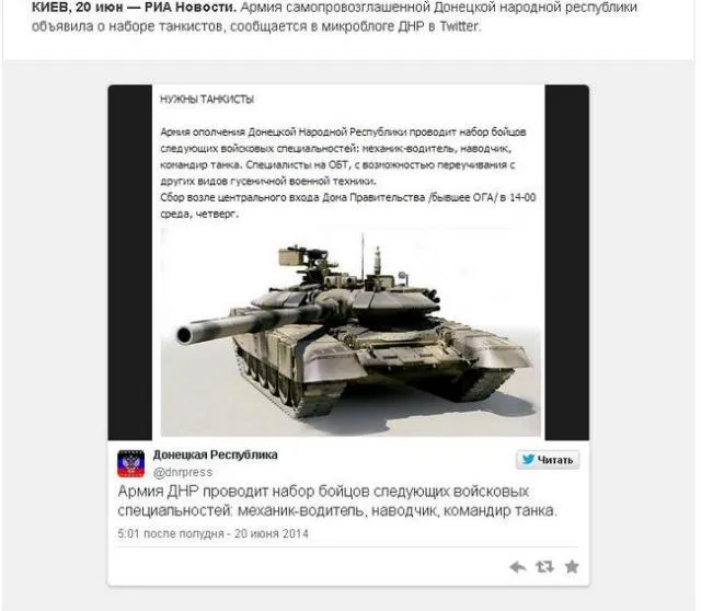 Террористы в Twitter написали о наборе "бойцов последующих военных специальностей: механик-водитель, наводчик, командир танка".