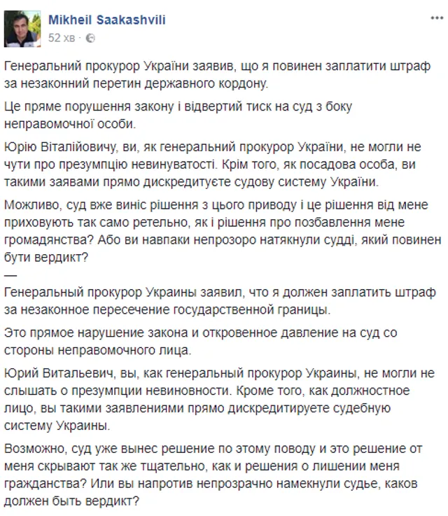 Юрий Витальевич, вы, как генеральный прокурор Украины, не могли не слышать о презумпции невиновности. Кроме того, как должностное лицо, вы такими заявлениями прямо дискредитируете судебную систему Украины,
