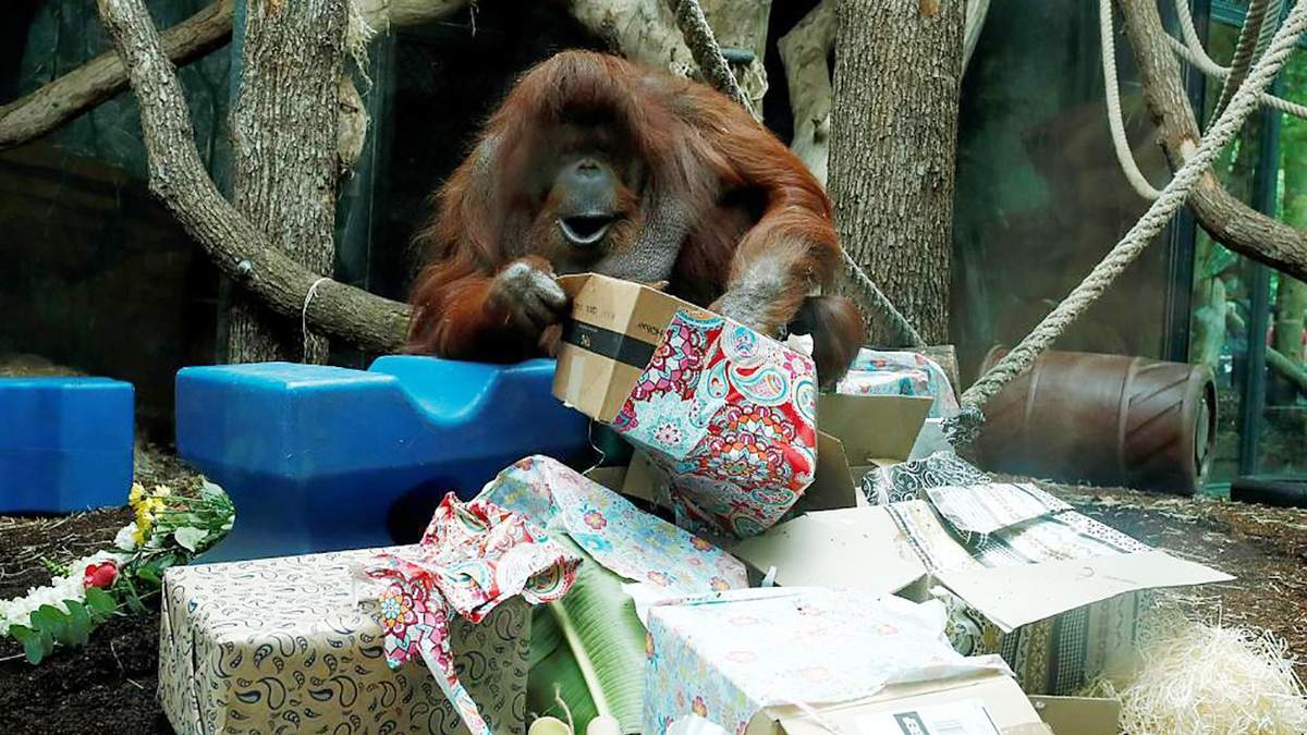 Смотрите трогательное видео: Самка орангутанга празднует 50-летие