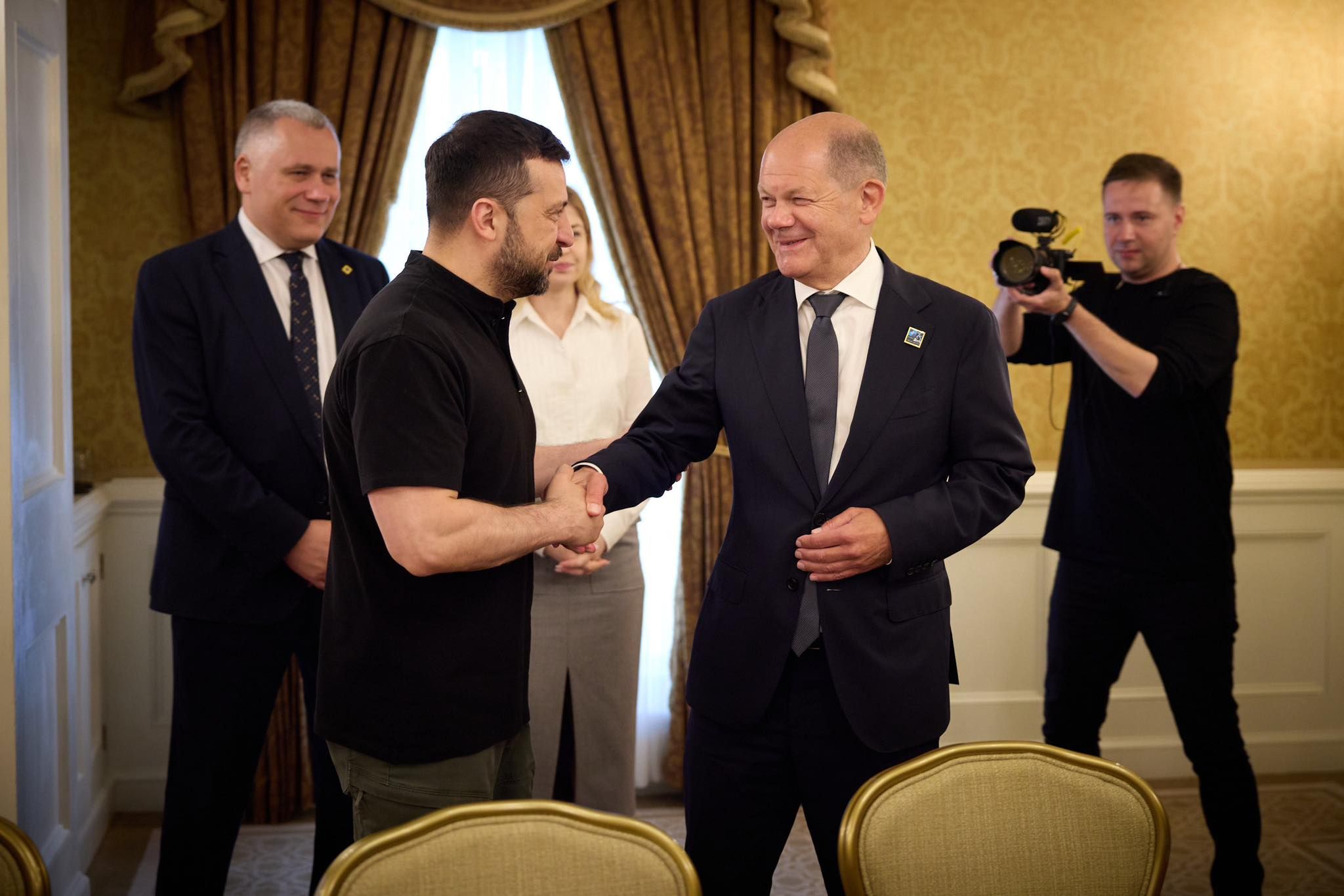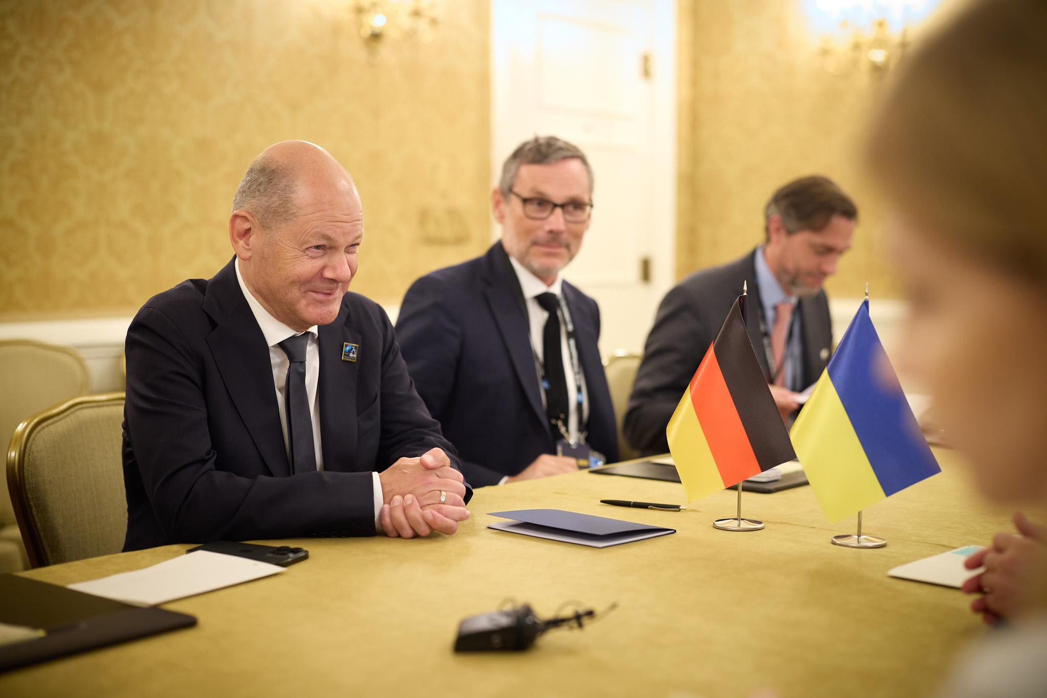 Встреча с Олафом Шольцем уже завершилась и была пока самой длительной из всех. Канцлер Германии имел радостный вид. Однако пока детали встречи неизвестны.