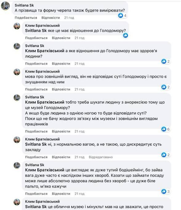 Вокруг музея Голодомора скандал не ограничился вопросом выделения средств на завершение строительства. Еще в 2022 году исполняющей обязанности генерального директора Национального музея Голодомора-геноцида стала этнолог и историк Леся Гасиджак. Однако через год после назначения в сети начали травить руководительницу музея из-за ее внешности.