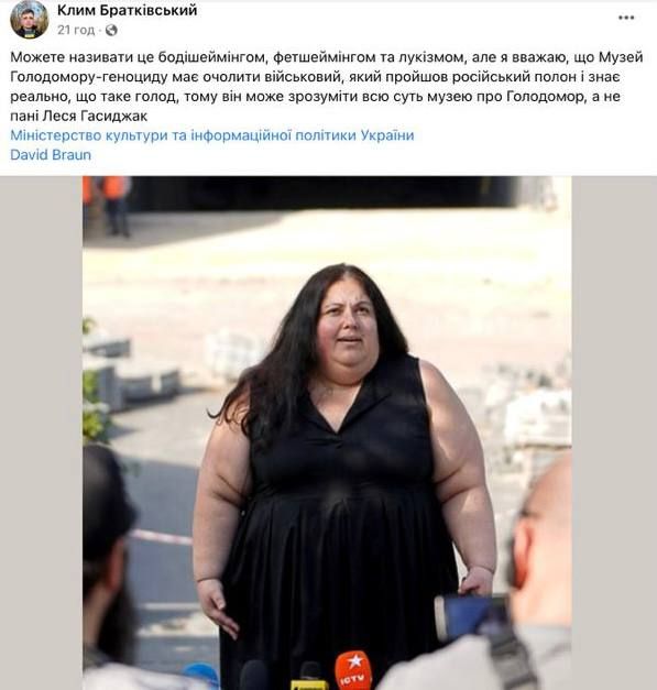 Юрист Клим Братковский в своем фейсбуке заявил, что Леся Гасиджак не может возглавлять музей Голодомора, потому что, по его мнению, "имеет неподходящую внешность". Он также заявил, что музей Голодомора должен возглавлять человек с "нормальным весом". Нашлись те, кто поддержал его слова и присоединился к травле, однако большинство украинцев возмутили слова юриста. Это вызвало серьезный скандал.