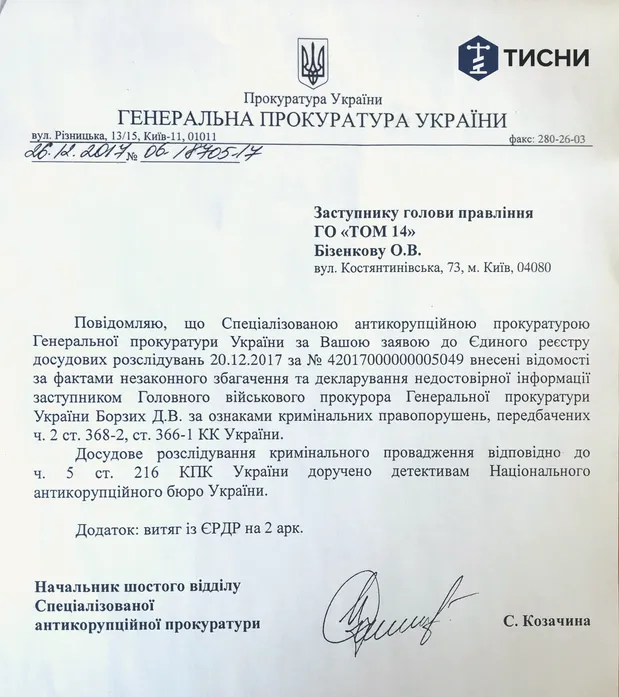Расследование в отношении заместителя Главного военного прокурора Дмитрия Борзых поручено детективам Национального антикоррупционного бюро Украины.