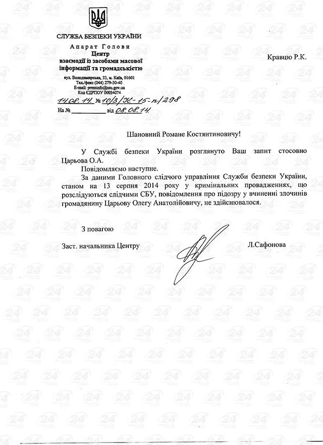 "По данным главы следственного управления Службы безопасности Украины, по состоянию на 13 августа 2014 в уголовных процессах, которые расследуются следователем СБУ, сообщение о подозрении в совершении преступлений гражданину Цареву Олегу Анатольевичу не проводилось", — ответили в СБУ.