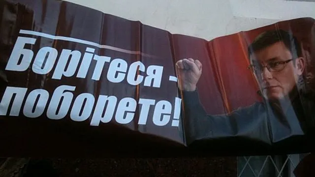 В руках они держат фото экс-чиновника и плакаты с надписями: "Я вернусь", "Свободу Луценко", "Боритесь - поборете!", а также плакаты "Народной самообороны".