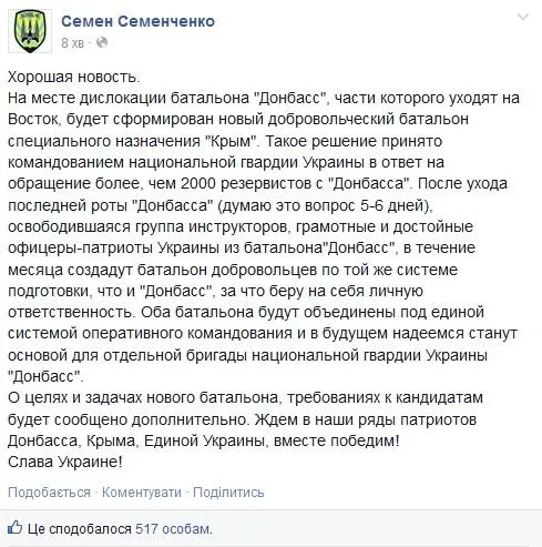 После ухода последней роты "Донбасса" (думаю это вопрос 5-6 дней), уволилась группа инструкторов, которые являются грамотными и достойными офицерами-патриотами Украины из батальона "Донбасс", в течение месяца они создадут батальон добровольцев по той же системе подготовки, и "Донбасс", за что беру на себя личную ответственность. Оба батальона объединят под единой системой оперативного командования и в будущем, надеемся, они станут основой для отдельной бригады Национальной гвардии Украины "Донбасс", — пишет Семенченко на своей странице в Facebook.