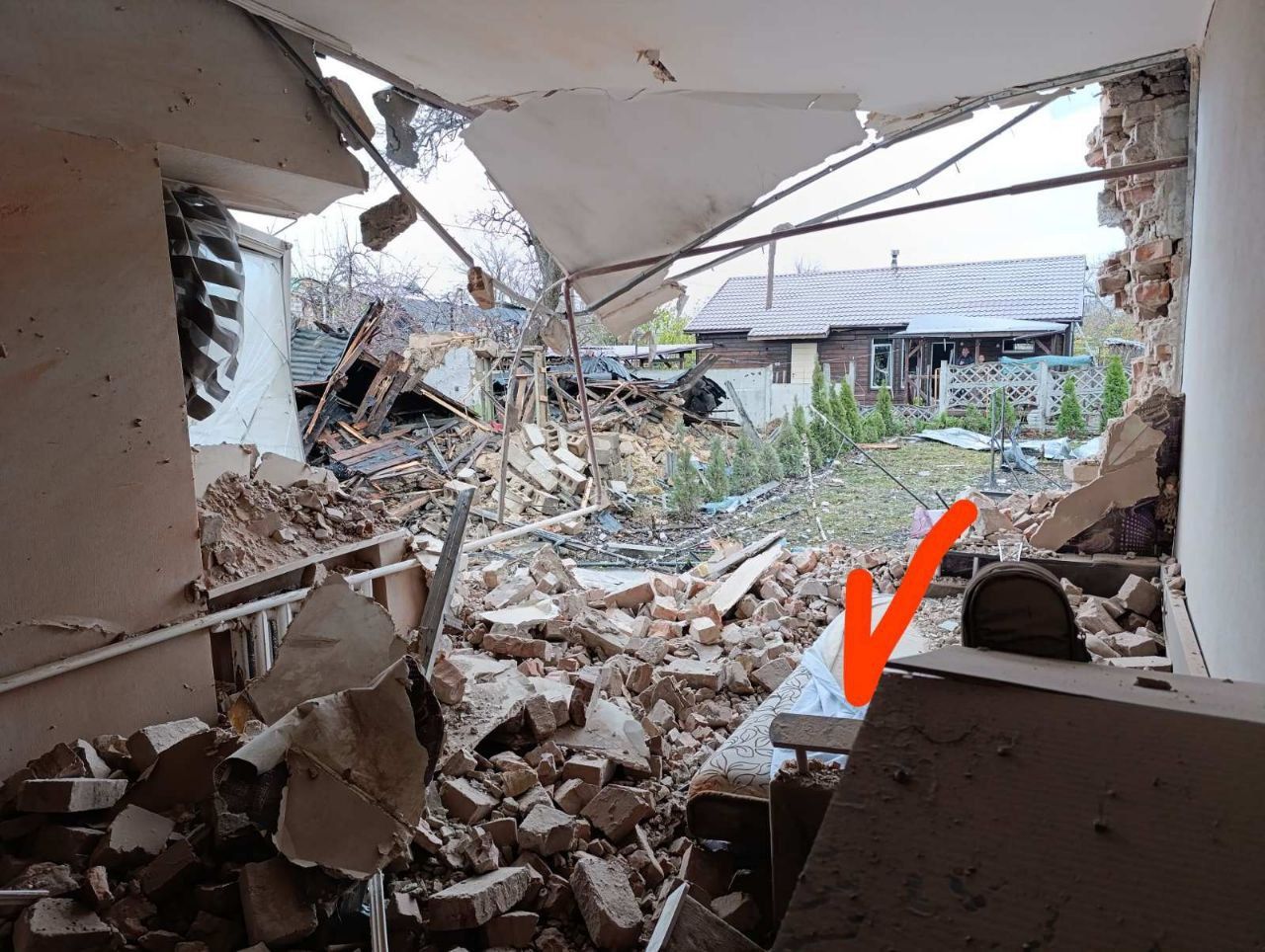 Дом после удара, галочкой обозначено место, где муж Татьяны оказался во время обстрела / Фото из архива семьи