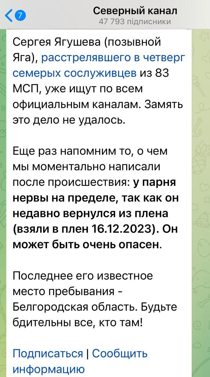 По данным российских пропагандистских пабликов, преступление совершил контрактник Сергей Ягушев, с позывным "Яга". Мужчина недавно вернулся в Россию в рамках обмена из украинского плена.