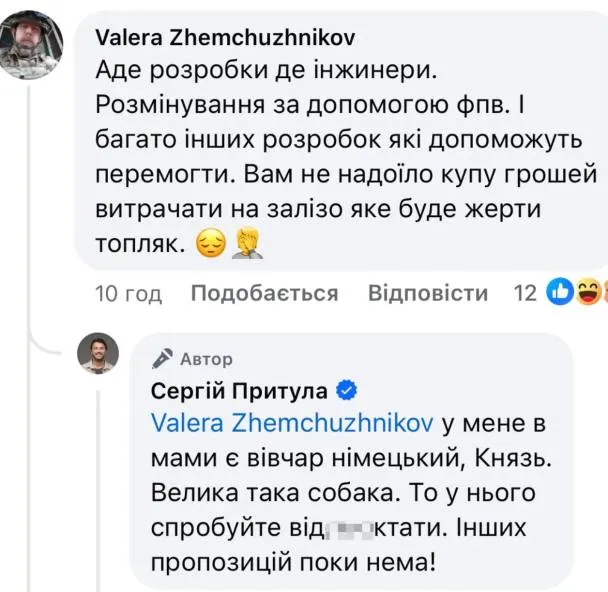 Сергей Притула в комментариях под одним из постов нахамил военному 3 Отдельной штурмовой бригады Валерию Жемчужникову. Тот прокомментировал сообщение активиста о передаче ВСУ транспорта, купленного за донаты.