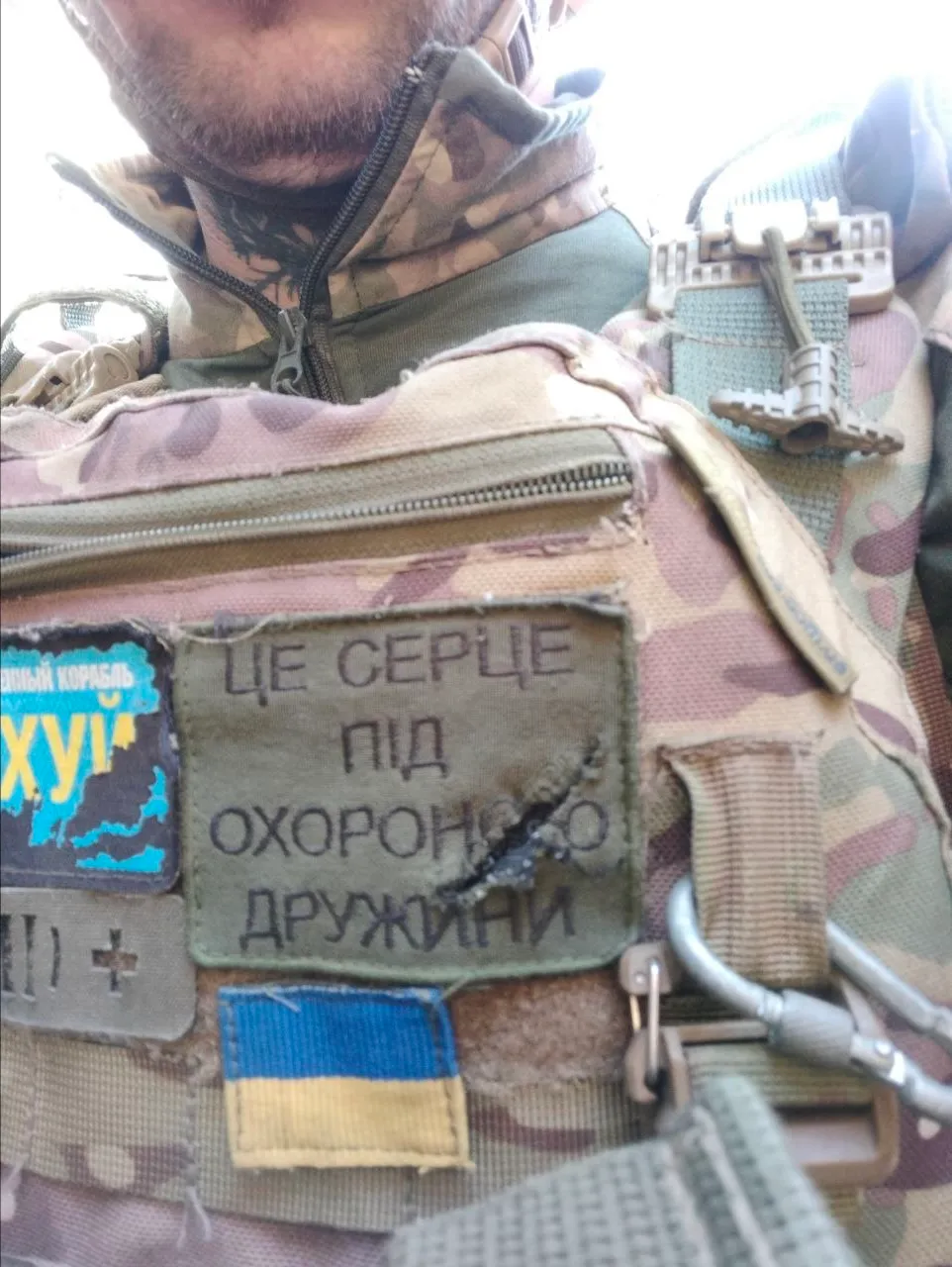 Во время очередного штурма в Сергея попала пуля, которая застряла между бронежилетом и телефоном, прорезав шеврон. На нем было написано "Это сердце под охраной жены". Он тогда мне сказал, что я его оберегаю,
