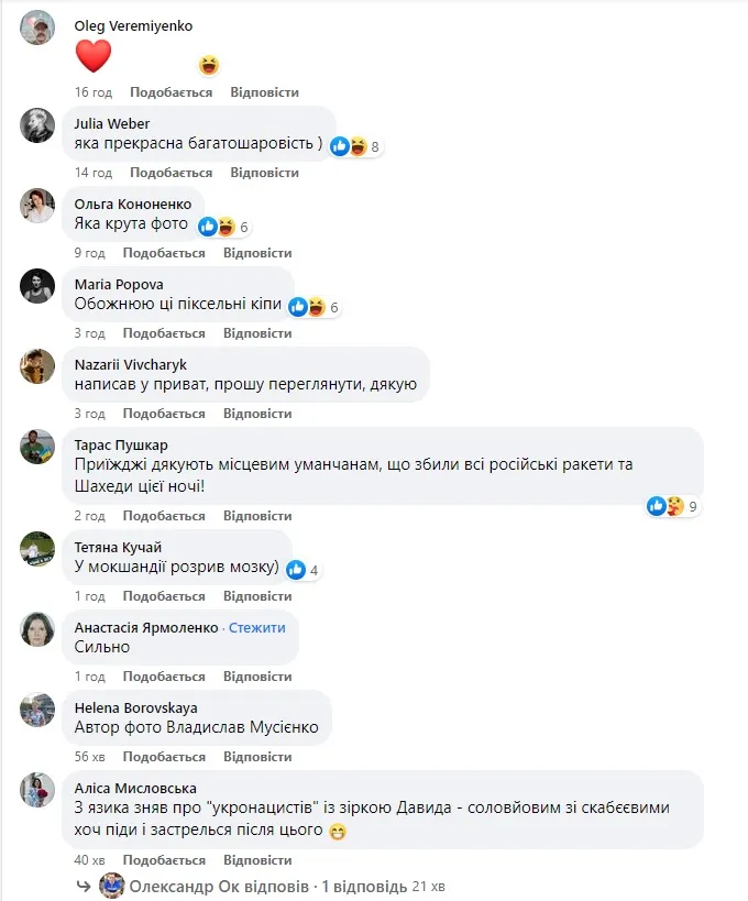 В комментариях к сообщению Владислава Мусиенко пользователи соцсетей выражают свое восхищение мощной фотографией.