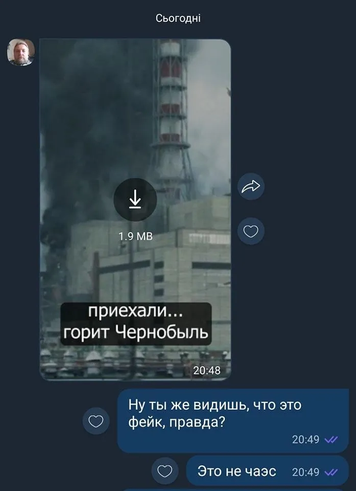 Уже 25 февраля в разных мессенджерах и соцсетях начали распространять видео о якобы пожаре на ЧАЭС. Скриншот с фейком опубликовал председатель Общественного совета Госагенства Украины по управлению зоной отчуждения Александр Сирота. При этом он также призвал украинцев быть внимательными и не вестись на дезинформацию.`