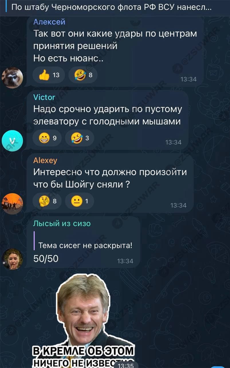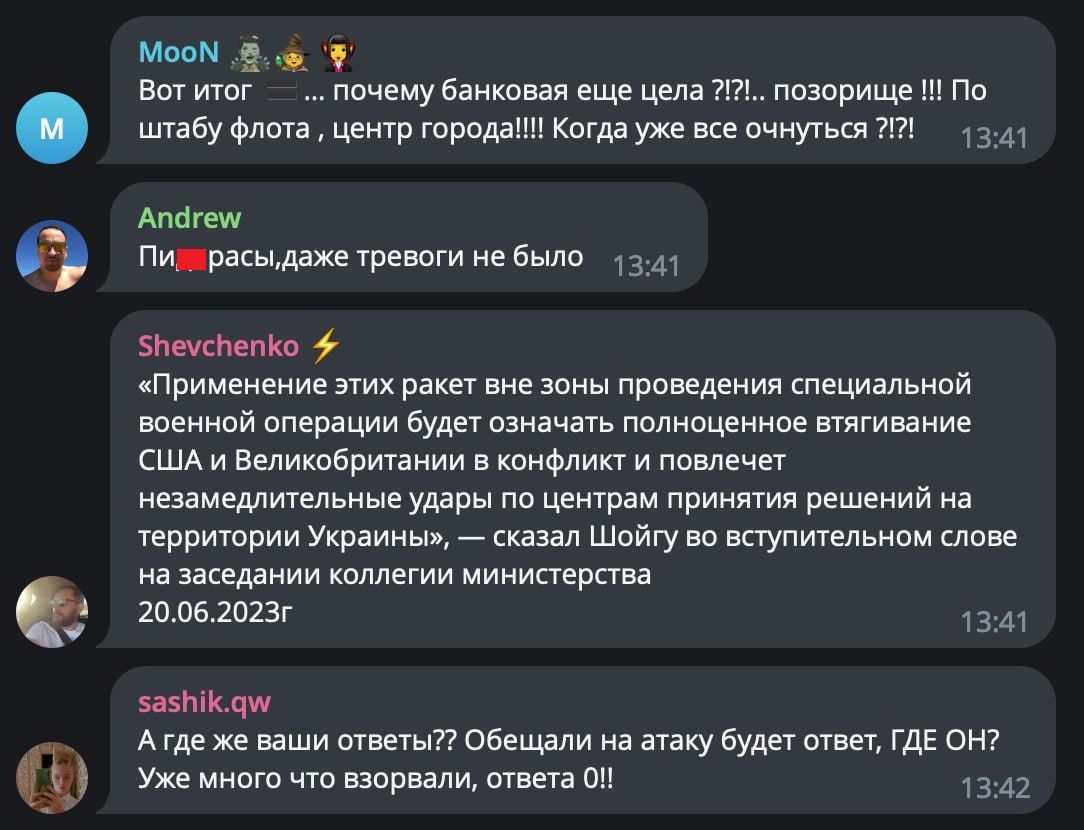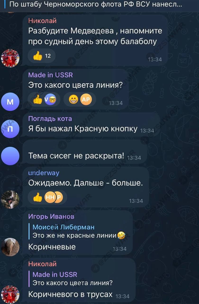 Часть россиян начала истерить из-за "красных линий", о которых так любят говорить в Кремле. В шутку пользователи сети уже говорят, что "красные линии" уже давно стали "коричневыми", ведь власти никак не реагируют на такие атаки. Один из пользователей вспомнил, как в июне 2023 года российский министр Шойгу заявил, что использование ракет Storm Shadow по российским военным объектам будет означать "втягивание в войну США и Великобритании". Впрочем, никакого подтверждения, что штаб россиян атаковали именно этими ракетами, нет, а эти утверждения есть только в мыслях россиян.