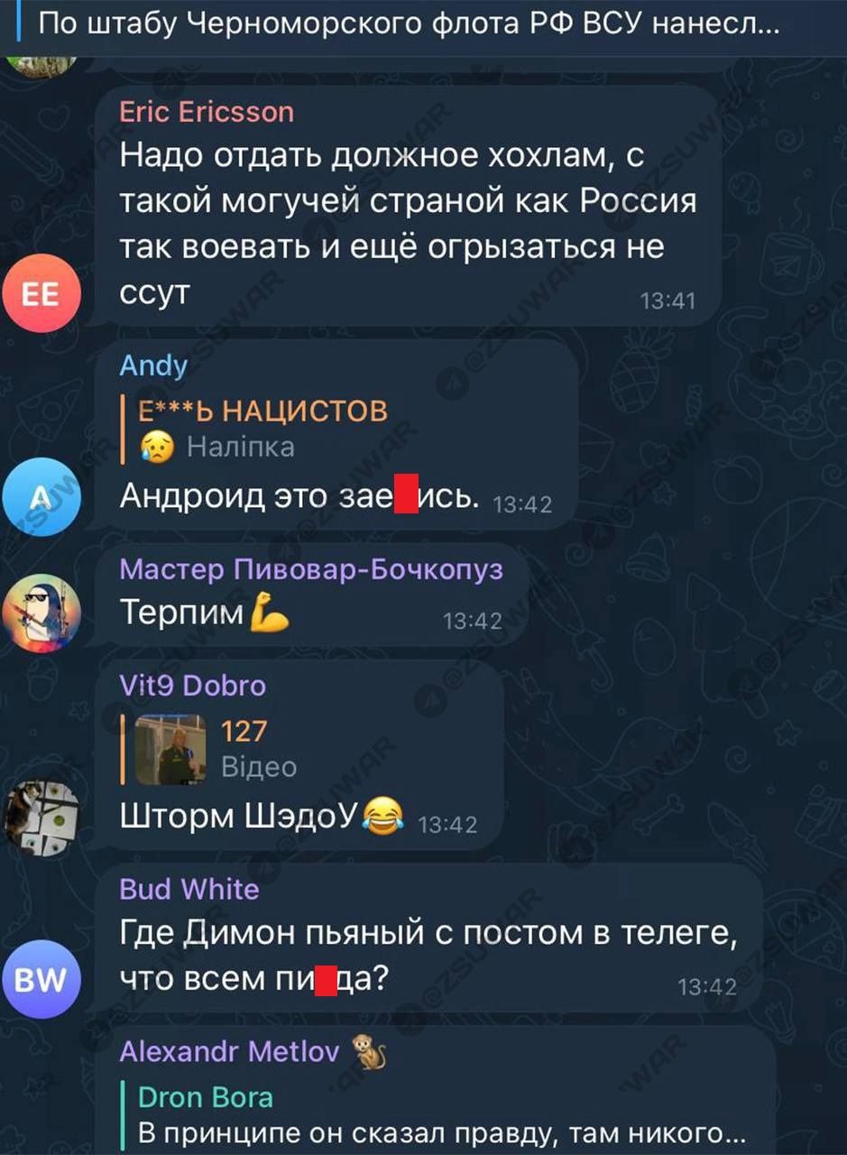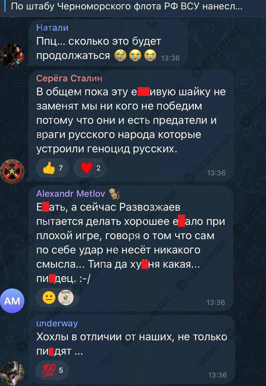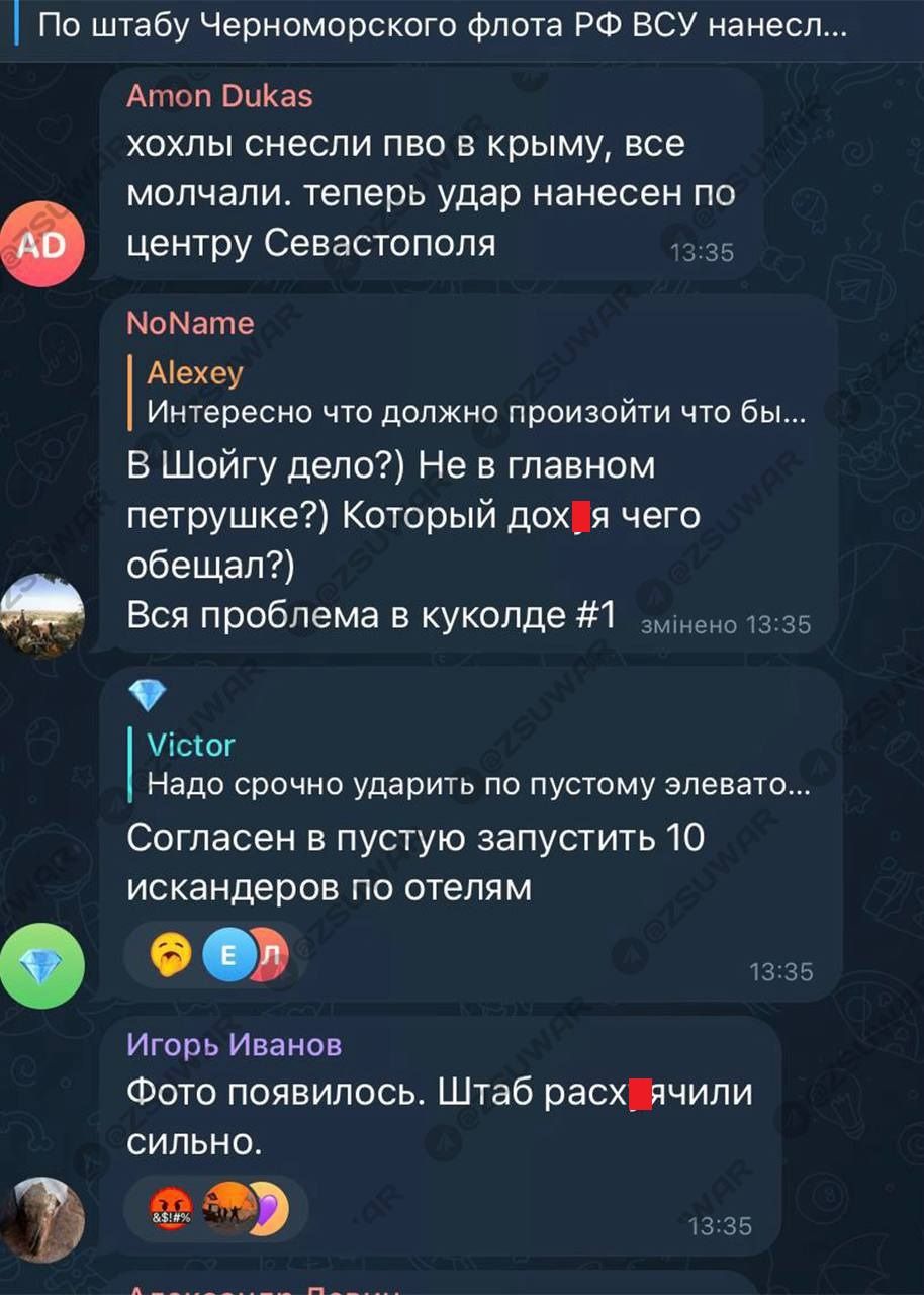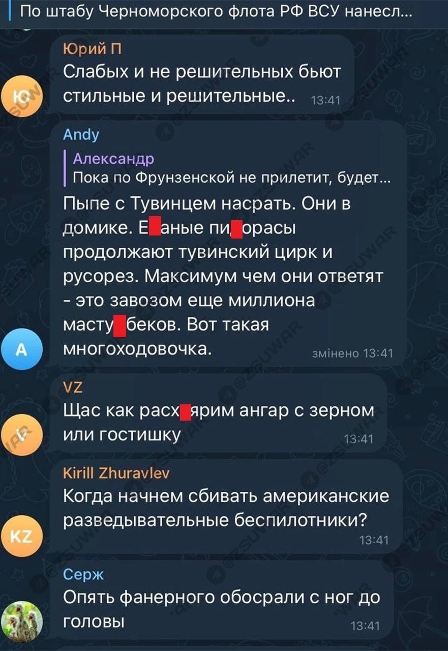 У россиян в сети традиционно началась истерика после взрывов и подтверждения того, что под ударом оказался штаб командования Черноморского флота России в Севастополе. Большинство цинично стали призывать к террористическим ударам по территории Украины, требуя, чтобы погибли мирные украинцы.