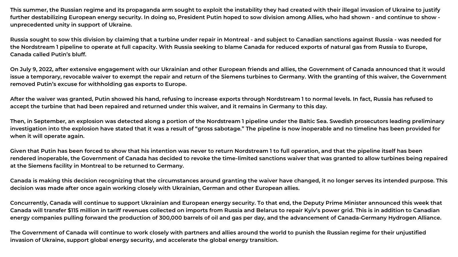 В МИД Канады отметили, что Россия пыталась посеять этот раскол, утверждая, что находящаяся на ремонте в Монреале турбина необходима для того, чтобы трубопровод "Северный поток 1" работал на полную мощность. Поскольку Россия пыталась обвинить Канаду в сокращении экспорта природного газа из России в Европу, Канада разоблачила ложь Путина.