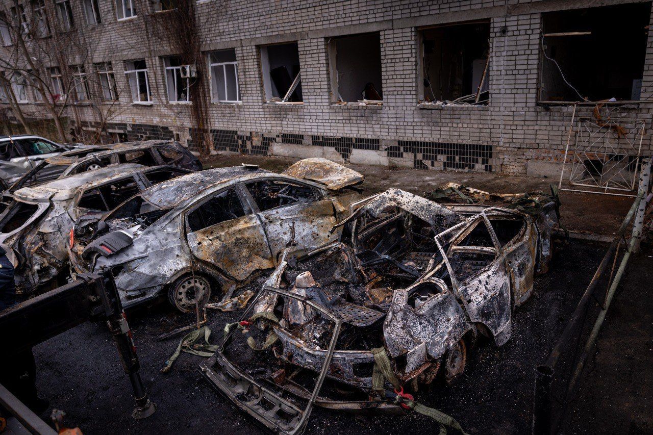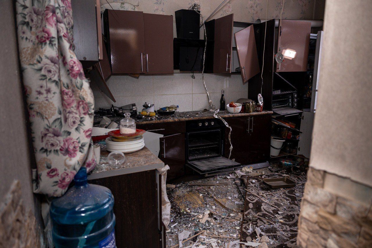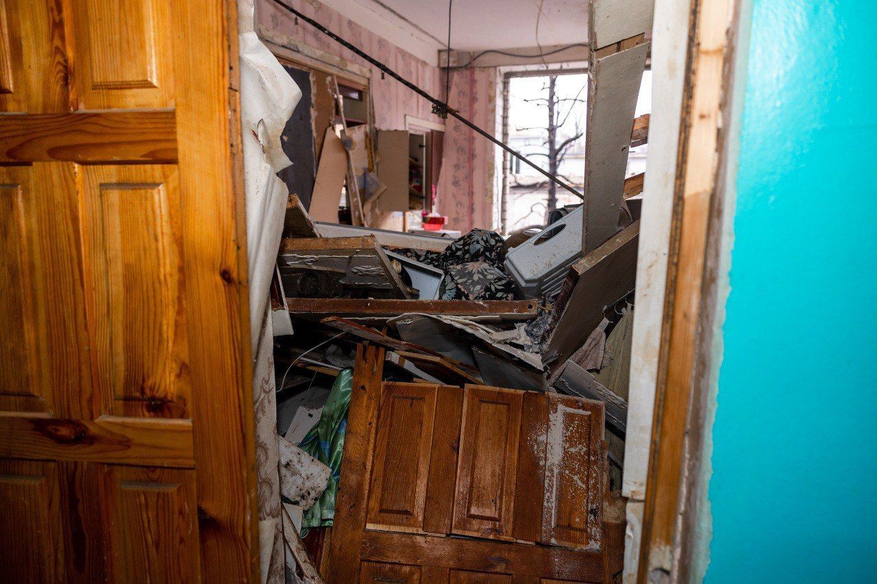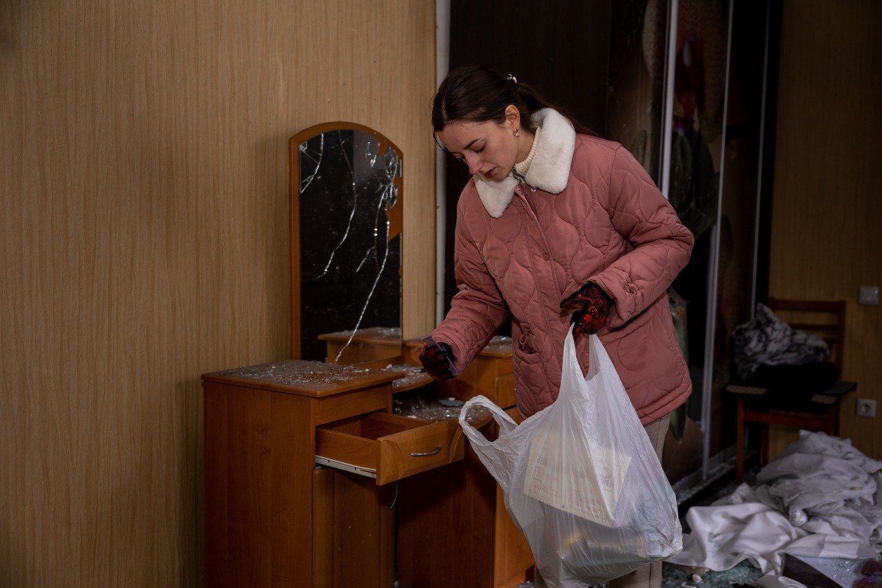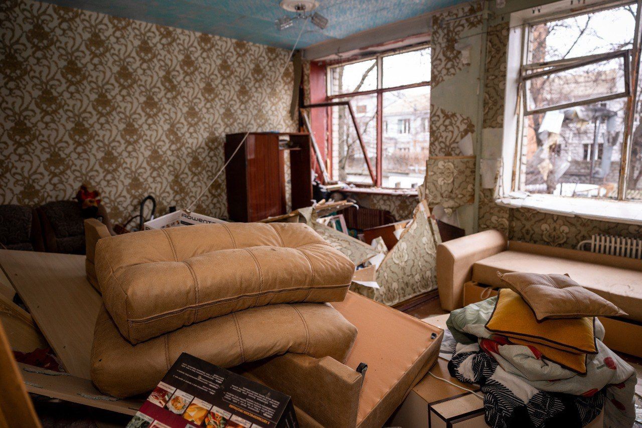 В Днепровской ОВА рассказывают, что в здании не уцелело ни одного оконного стекла, поэтому по коридорам и квартирам гуляет холодный ветер. На полу – много битого стекла. Мебель разбита. Жители общежития мешками выносят обломки из своих домов.