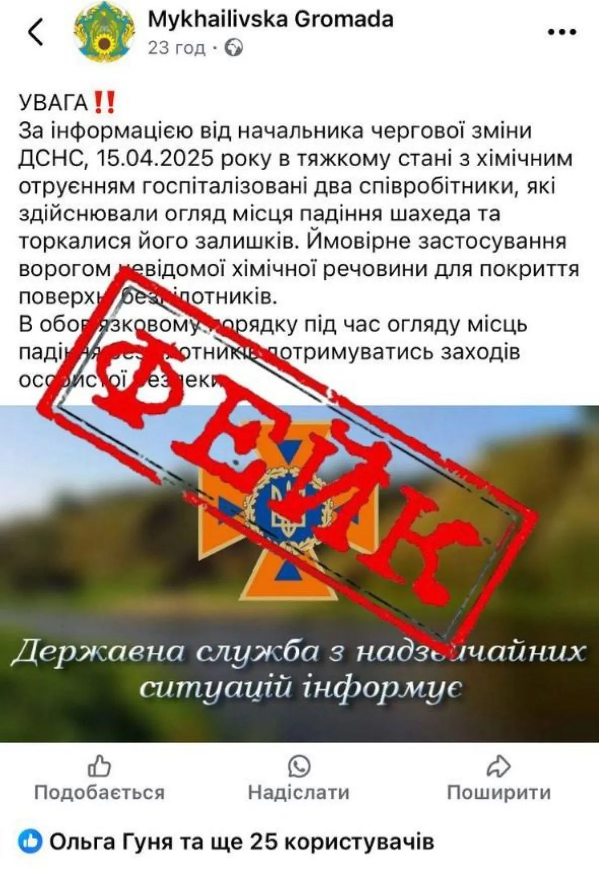 Официально заявляем: эта информация не соответствует действительности. Ни одного случая химического отравления среди спасателей в результате осмотра места падения БпЛА в Полтавской области не зафиксировано,
