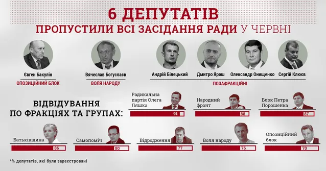 Всего в июне состоялось 11 пленарных заседаний Рады. В среднем на них были зарегистрированы 351 из 422 народных депутатов.