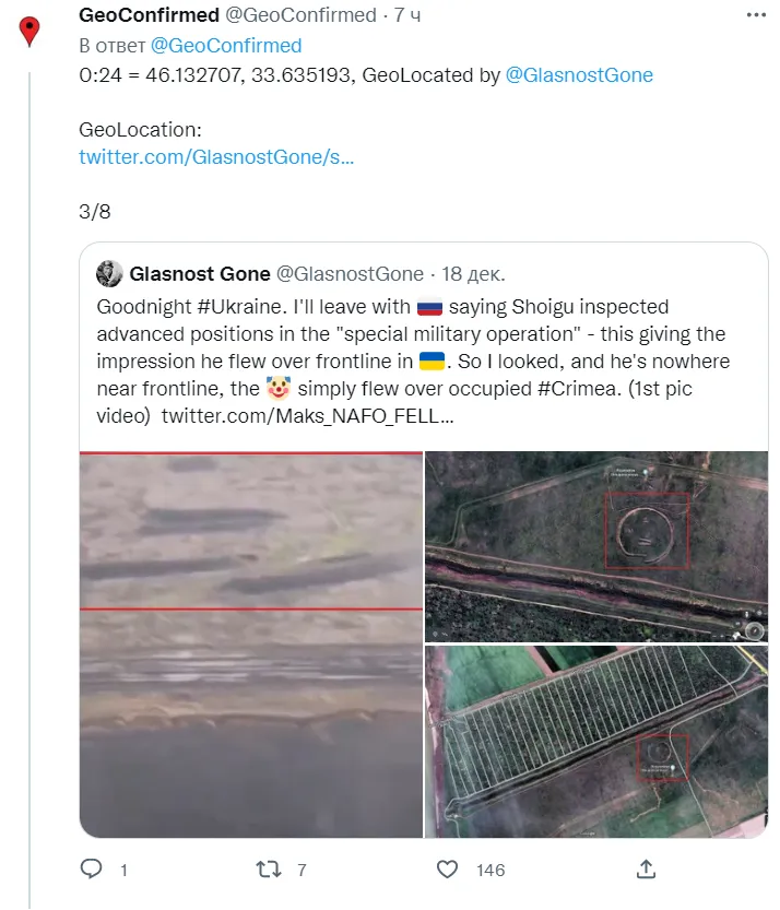 Однако проект GeoConfirmed установил, что, несмотря на заявления российского министерства, на опубликованном ведомством видео Шойгу находился в десятках километров от передовых позиций оккупантов.