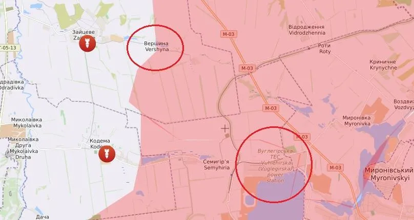 россияне пытались пойти на штурм с Углегорской ТЭС в направлении Вершины / Скриншот карты боевых действий