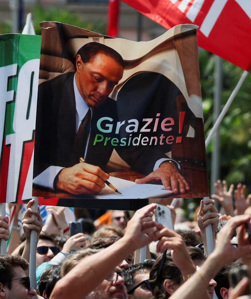 Однако на церемонию прощания люди пришли не только выразить траур по Берлускони, но и начали протестовать. Не все итальянцы поддерживали политику друга российского диктатора Владимира Путина, поэтому провожали в последний путь Берлускони и с плакатами "Сегодня мы не скучаем – мы боремся".