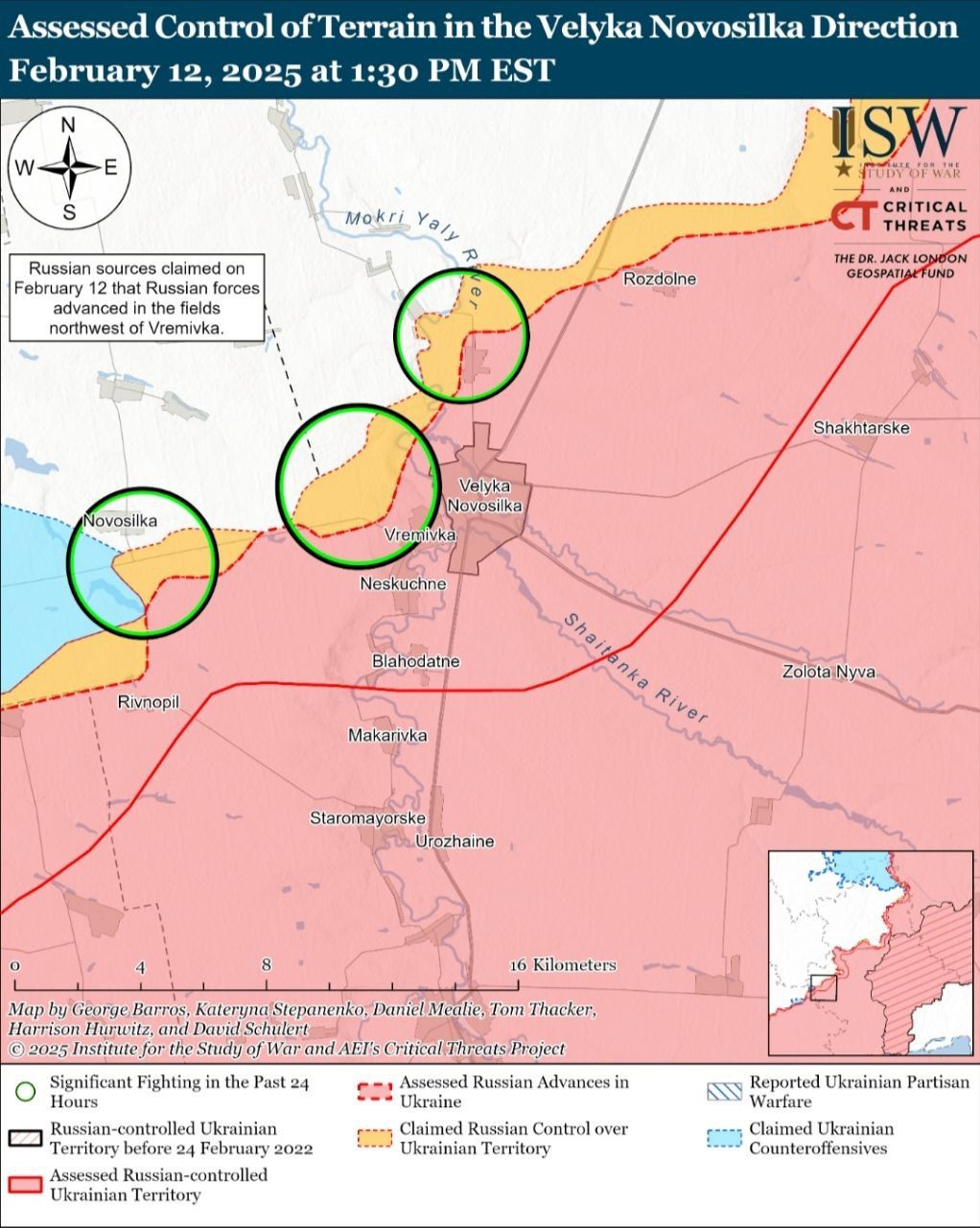 - Российские войска 12 февраля продолжали наступательные действия вблизи Часового Яра, но не смогли продвинуться. Они атаковали вблизи и в пределах города, к северо-востоку от Часового Яра вблизи Васюковки и Григорьевки, к северу от Часового Яра в направлении Миньковки и Майского и на юг возле Ступочек.