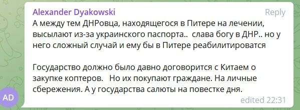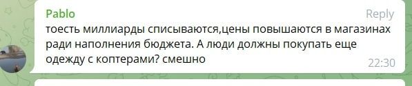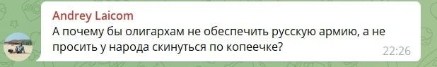 В то же время, россияне бурно отреагировали на такие призывы журналистки. Они пишут, почему граждане должны скидываться по копейке, а российские олигархи не могут обеспечивать армию. Также пишут, что цены растут, миллиарды списываются, а россияне должны покупать коптеры военным, вместо этого россия запускает салюты.